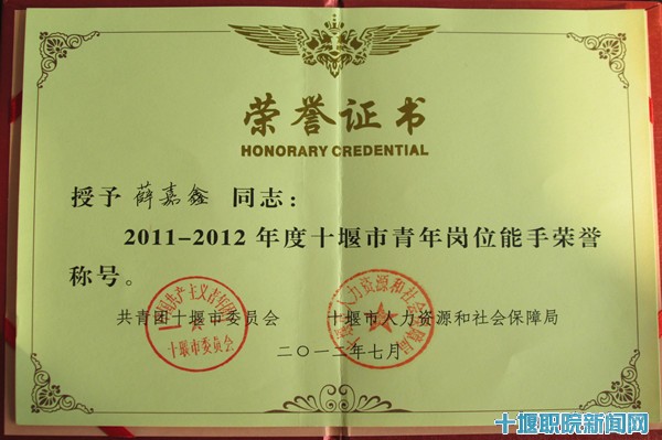 据悉,为表彰2011年以来全市各级各单位深入贯彻落实科学发展观,扎实开展“四创建功”活动,激发广大青年职工立足本岗位,学习新知识,掌握新技术,创造新业绩所涌现出的一批熟练掌握专业技能、立足岗位创新创效的青年职工典型,共青团十堰市委、市人力和社会保障局从全市各有关单位申报的人员中评比遴选后,决定授予薛嘉鑫等50名同志“2011-2012年度十堰市青年岗位能手”称号,开元官网有二名教师被评为“十堰市青年岗位能手”。