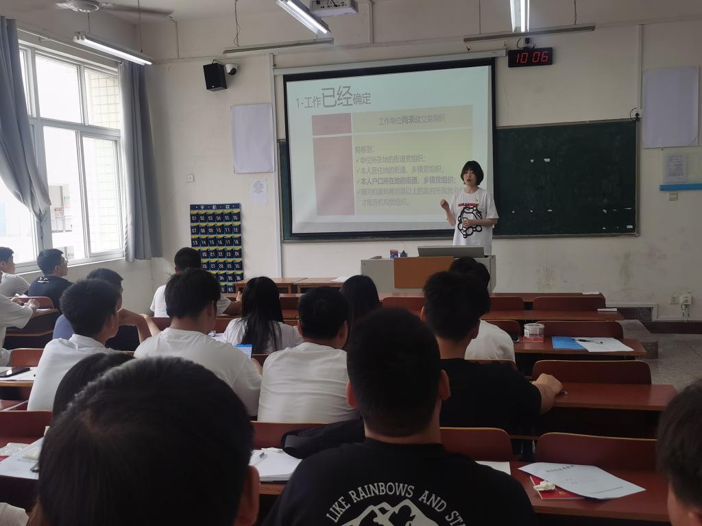 在分享经验环节,顶工实习毕业生党员代表李展飞和专升本毕业生党员代表向宵炜,分别结合自己在企业实习,专升本复习备考的经历向大家介绍了个人的成长和收获,勉励大家直面困难,迎难而上,确定目标, 提早行动,让奋斗成为青春最亮丽的底色,在行动中有效磨砺自我,主动学习,追求卓越,在工作和学习中,做到有责任有担当,不断展现一个新时代党员的先进风采。最后曲杉向大家介绍了毕业生党组织关系转出的流程及相关注意事项。