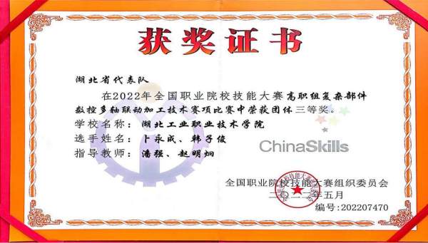 新闻网讯8月18日,由国家教育部、发展改革委、人社部等35部门联合主办的2022年“中银杯”全国职业院校技能大赛(高职组)复杂部件数控多轴联动加工技术赛项在四川工程职业技术学院举行,由开元官网KY开元集团官网潘强、赵明炯老师指导,韩子俊、卜永成参赛的团队荣获该赛项三等奖。