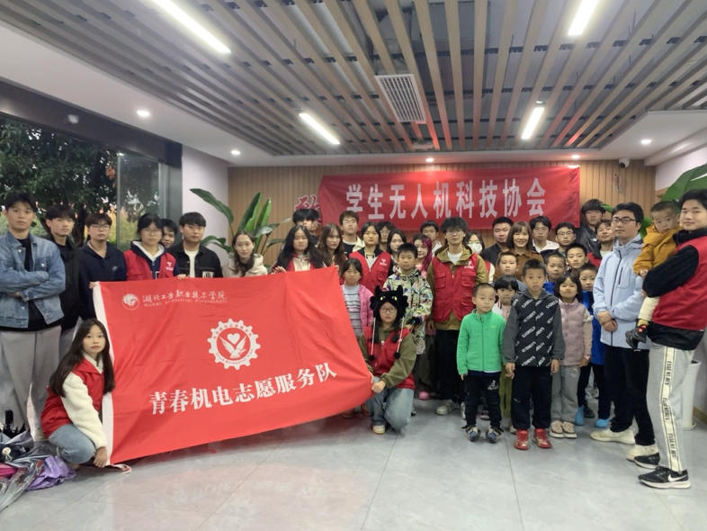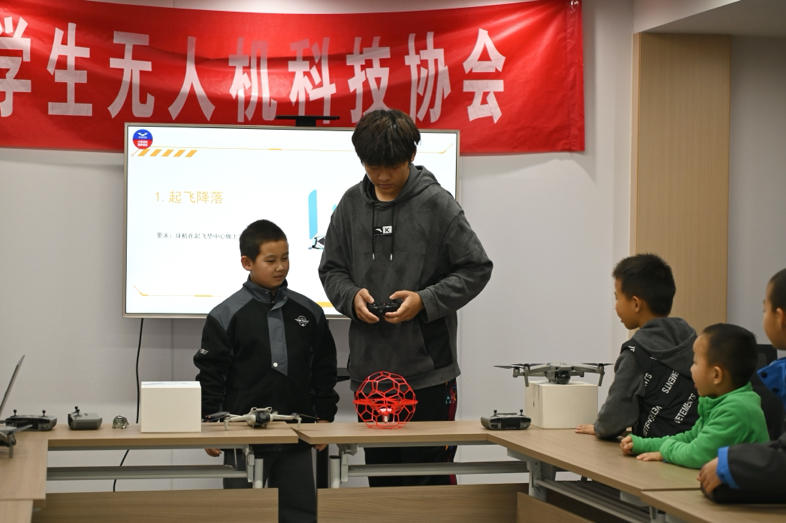 过程中,无人机科技协会成员杨钧宇进行了“足球无人机”“小型无人机”飞行表演,包括起飞、悬停、航线飞行等简单特技,在场的孩子们目不暇接,近距离体会到了无人机的魅力。表演后,青春机电志愿服务队的志愿者手把手带领孩子们体验到无人机乐趣,活动进行的井然有序。