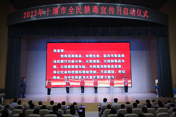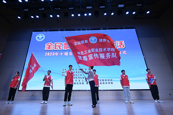 活动中,市禁毒办向湖北汽车工业学院、湖北医药学院、汉江师范学院、湖北工业职业技术学院4所高校学生代表授予“大学生禁毒志愿者服务队”队旗。大学生志愿者代表进行了禁毒宣誓,向广大人民群众和青少年学生发出“识毒、拒毒、禁毒”的倡议。现场播放了禁毒公益宣传片,同时向全市毒品预防教育先进集体和先进个人颁发了证书。