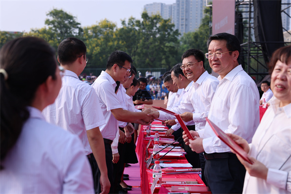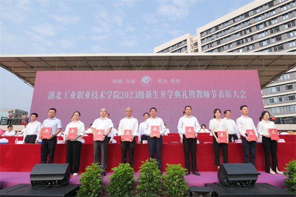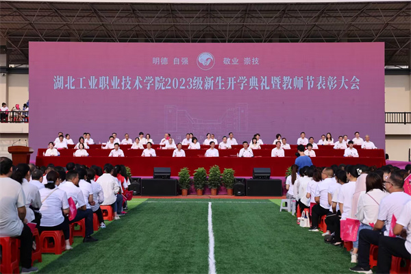 新闻网讯(文/记者 陶亿 图/记者 熊超 曾刚 学生记者 刘轶凡)爽爽秋风送炎暑,处处焕新迎开学。在第39个教师节来临之际,9月9日上午,湖北工业职业技术学院2023年秋季新生开学典礼暨教师节表彰大会在北区运动场举行。校领导魏文芳、边疆、毛义忠、郑强、胡昌龙、陈穗川、李辉和17000余名师生通过线下线上方式参加了开学典礼暨表彰大会。典礼由校长边疆主持。