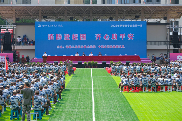 新闻网讯(文/通讯员 权舒祎 图/记者 曾刚 学生记者 罗杨洋 李世杰 黎兆君)为增强师生消防安全意识和自防自救能力,树立学生以安全为主的自我保护意识,学校于9月9日下午在北区运动场组织2023级新生开展了“开学第一课暨消防安全进军训”主题教育活动。十堰市消防救援支队副支队长黄全海、茅箭区消防救援大队大队长王林,开元官网副校长郑强参加了此次活动。