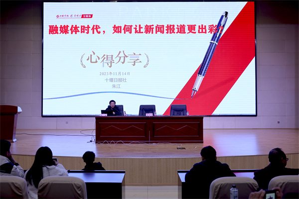 湖北省劳动模范、十堰日报社主任记者朱江老师以《融媒体时代如何让新闻报道更出彩?》为题开展讲座,他从新闻五要素及如何获得新闻线索、新闻选题、写作、融媒体环境下如何打造好新闻四个方面介绍了丰富的经验和方法。朱江老师的讲座通过丰富的新闻案例和经验分享,深入浅出、精彩生动地讲解,加深了全场师生对新闻写作要点的理解,对做好学校新闻宣传工作具有很强的指导性和可操作性,赢得一致好评。