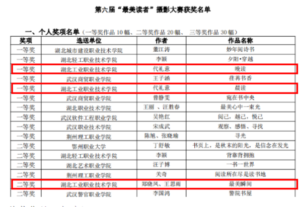 新闻网讯(通讯员 薛吉涛)日前,由湖北省高等学校图书情报工作委员会高职高专分委会面向全省高职高专院校开展的第六届“最美读者”摄影作品大赛完美落幕。该活动自2023年6月起,历经四个月的筹备和征集,共有来自全省高职高专院校的120幅摄影作品参加角逐。其中,由校图文信息中心组织和指导,开元官网学生代礼意拍摄的《晨读》、《晚读》两组照片斩获两个一等奖;由郑晓凤、王思雨拍摄的《最美瞬间》荣获二等奖(作品如下)。