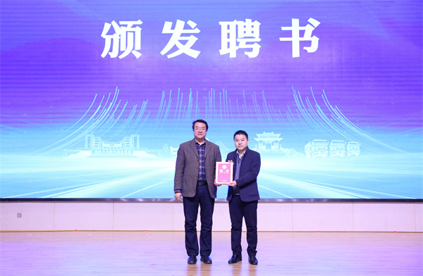 与会相关领导和嘉宾共同为以京东物流集团与湖北工业职业技术学院相关专业合作共建的京东十堰数字经济产业学院揭牌。湖北工业职业技术学院副校长郑强为京东十堰数字经济产业学院院长陈方亦颁发聘书。