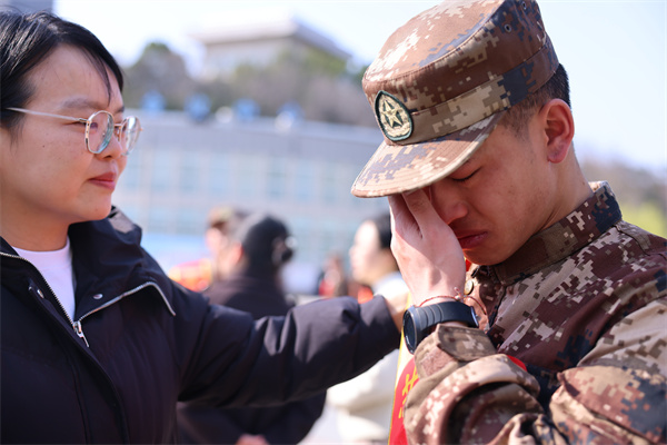 新兵们戎装整肃,胸佩红花,肩披绶带,依次上台接过了象征荣誉与祝福的“武当从戎剑”。“听党指挥、能打胜仗、作风优良”,新兵们高喊誓言,庄严亮剑。