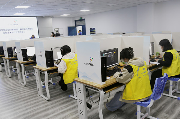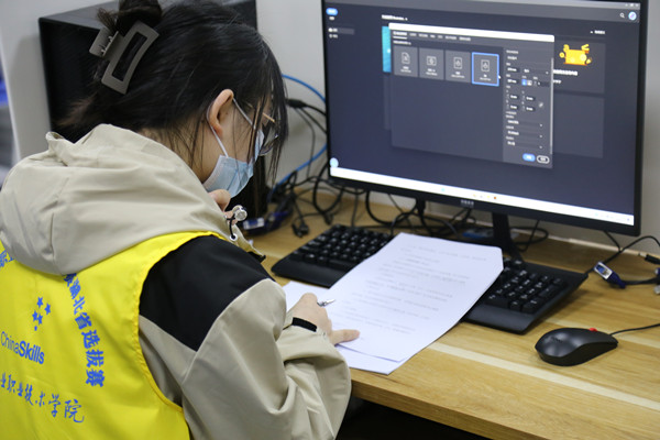 24日上午,比赛开始。裁判员分发考题,参赛学生熟练操作、认真答题。比赛既考验了参赛选手审美能力、价值判断等方面的技能水平,也展示了各位选手好的竞技状态和技能实力。各参赛院校领队、指导老师在会议中心观摩赛况直播。