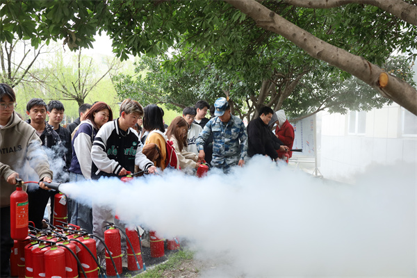 活动共分为三个部分,上午在学校和山会堂进行了消防安全知识培训、微型消防站现场的灭火演练以及灭火器、室内外消火栓的体验操作;中午在北区嘉园5 号学生公寓组织了学生消防疏散演练;下午前往十堰市消防救援支队训练基地参观。