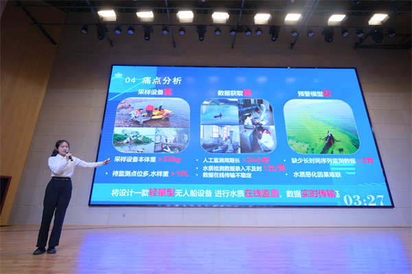 本次大赛组委会邀请了十堰市科技局、人社局、团市委相关领导和驻市三所本科院校创新创业学院院长担任评委,15个项目依次进行了5分钟的项目陈述和3分钟的评委提问。参赛选手们在知识的海洋中劈波斩浪,探索未知的领域,他们勇于突破传统,用创新的思维和独特的视角诠释了科学的魅力。经过激烈角逐,《未来可“漆 ”——AI赋能非遗雕漆产业升级驱动者》、《优化创新 设计赋能——引领绿松石时尚精品新时代》等5个项目斩获校赛金奖;《净水卫士——基于蓝藻收集脱水的智能无人打捞船》、《一起飞——无人机飞手培训一站式服务领跑者》等10个项目荣获校赛银奖。