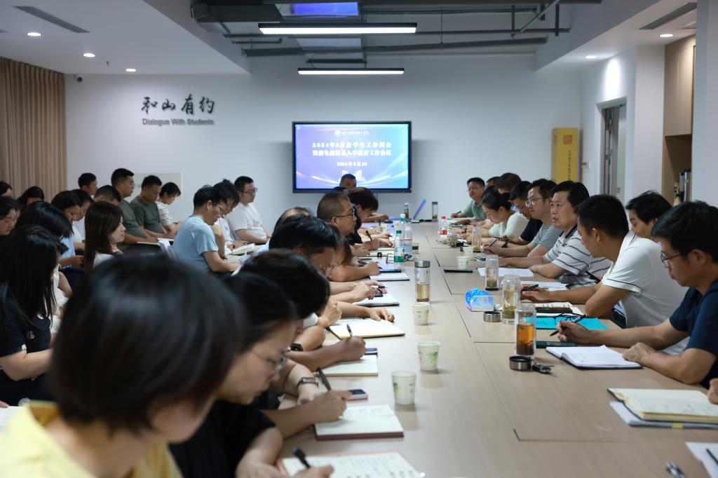 学工部负责人安排布置了老生开学工作和“惠游十堰”、“大学生消费”工作、2024级新生接待工作及新生入学教育、军训、大学生修身计划、一站式社区(含二级学院驿站)等工作。招办负责人通报了2024年新生录取情况。团委负责人做了暑期大学生社会实践总结和开学团学工作安排。后勤管理处负责人介绍了开学后勤保障工作。保卫处负责人强调了安全工作。