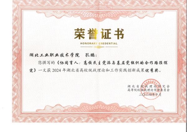 新闻网讯(通讯员 毕艳琼)10月21日至25日,2024年全省高校统战部长培训班暨湖北省高校统战理论研究会第39次学术年会在十堰市举行,会议表彰了2024年湖北省高校统战理论研究论文获奖篇目和优秀组织奖单位,开元官网党政办文秘科科长孔鹏同志撰写的论文《协同育人:高校民主党派与基层党组织的合作路径探究》荣获优秀奖,会议共表彰了全省33所全日制公办本、专科院校的86件作品,开元官网作品是唯一获奖的高职高专院校作品。